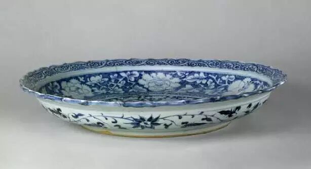 元 青花鸳鸯荷花(“满池娇”)纹花口盘,元,高7.3cm,口径46.4cm,足径29.8cm。