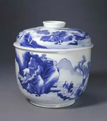 Can straight mouth, short neck, full circle.The cover is flat, slightly folded, with a ring grip.Canister body decoration green landscape figure pattern.Green flowers beautiful green, fresh and bright, with the artistic effect of ink painting.The picture is well-organized and three-dimensional.The literati in the painting, the old man alone fishing image vivid.It is the representative of the folk blue-and-white porcelain of Kangxi Dynasty.