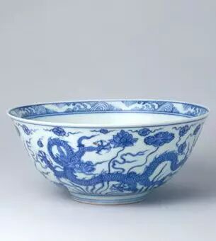 The bowl is open, and the circle is full.The outer mouth draws the money pattern a week, the outer abdomen sea water ground draws the different form 9 dragons.The bowl heart double circle interior decoration sea water dragon grain, the base book blue and white double circle inside regular script “big bright becomes a new year” six words.