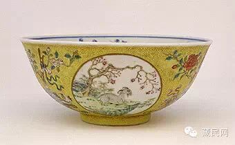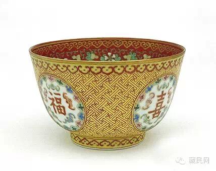 Bowl straight mouth slightly open, deep abdomen, circle foot.Gesture gold, inner wall red paint Ruyi cloud pattern and tangled branch gourd pattern, outer abdomen yellow glaze on the ground painted red color ruyi cloud pattern, the theme pattern is four round open light, the inside is” Fu “,” Lu “,” Shou “,” Xi “four regular script red character, Each word is surrounded by five bats and a week of Ruyi lines, including the meaning of “five bats holding longevity”.The outer bottom yellow glaze on the ground drawing pen, ingot, Ruyi combination pattern, meaning “must be as good as you like”.