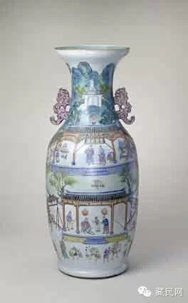 Bottle wash mouth, thick neck, long round abdomen, circle foot, sand bottom.The neck and shoulder are fitted with the ears of two exotic animals.White glaze is applied in the inner part of the bottle, from shoulder to neck and inside mouth.The outside of the bottle depicts the actual picture of the Zhushan Imperial Kiln Factory in Jingdezhen in Qing Dynasty. It is centered on the Imperial Pavilion, which is built on the mountain. On the east and west sides, there is a big flag of “Imperial Kiln Factory” hanging on each side of the east and west gate, with black tiles on both sides of the white wall, including a corridor and a cave door.In the middle of the tall hall, a few people in the discussion of things, the factory craftsmen each work, is dedicated to work, mining, feeding, drawing, molding, glaze, blowing glaze, painting, painting, billet, kiln, kiln, shipping, and so on, a busy scene.This bottle is painted with pink, yellow, green, purple, blue, black, gold and other colors 61 people. It truly reflects the production scene of imperial kiln in Qing Dynasty, and confirms the construction, division of labor and production of imperial kiln in the relevant documents, which can be used as the first-hand material for our study of imperial kiln.