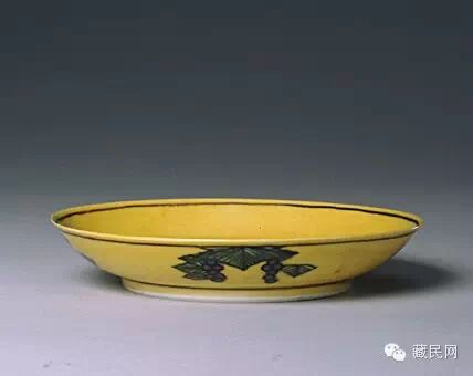 Yellow ground purple green dragon grape pattern dish, clear light, height 2.3 cm, diameter 13 cm, foot diameter 8 cm.