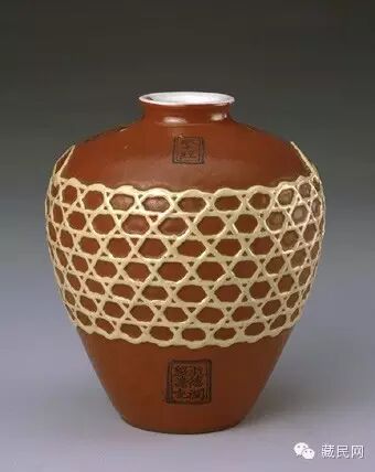 Wine altar small mouth, wide shoulder, shoulder gradually under, flat.Full body with low-temperature red glaze, shoulder, abdomen decorated like bamboo-woven yellow pocket-like lines.The two sides of the shoulders in the frame of the ink book “shape Yuan Hong”, “old wine” words, near the bottom of the “Zhejiang Shao Run Lian” square mark.