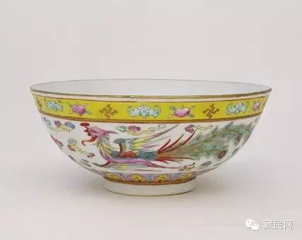 This bowl-shaped Zhou Zheng, soft lines, purple, red, blue, pink, yellow, green color setting, colorful, fine painting, composition full and clean, is a fine powder enamel porcelain.Fangcai phoenix pattern is the decorative pattern of official kiln porcelain since the Qianlong period of Qing Dynasty.