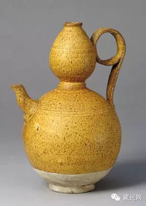The pot for gourd-shaped, small lower, upper lip, such as egg-shaped, waist-shaped, round and large lower abdomen, the bottom of the circle foot.The shoulder is decorated with two chords, one side is curved flow, the other side is ring-shaped long handle, the handle is printed on the sun pattern, under the handle is decorated with a milk nail.Full body yellow glaze, near foot tire, foot have 5 branch burn mark, under the glaze apply white make-up soil.