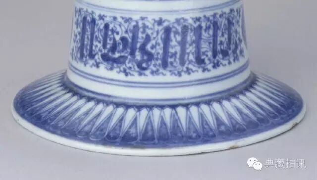 The vessel is cylindrical, hollow and bottomless. The upper and lower ports are all wide, with straight walls and a convex edge in the middle of the abdomen.The whole body is covered with blue and white flowers, the upper and lower parts are painted with banana leaf pattern, the upper and lower parts are decorated with twining pattern, the upper part is written in Arabic, the middle part of the body is bounded by convex edges, and the symmetrical part is decorated with lotus leaf pattern.