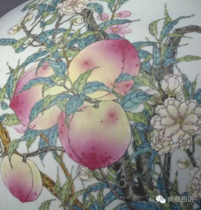 The nine-peach pattern decorative porcelain is the subject matter and style of official-style porcelain since Yongzheng, until Guangxu Dynasty there are still imitation.The nine peach patterns of the yongzheng dynasty may be found either in a powder-colored sky-ball vase, a powder-colored olive vase, or in an over-twig powder-colored disk.On all the powder-colored nine-peach pattern porcelain of Yongzheng, Qianlong and Guangxu periods, the patterns of the Yongzheng period were the most colorful and varied, and the painting level was the highest.