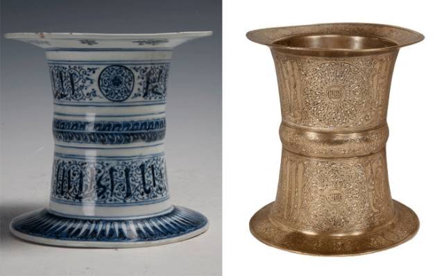 The unobstructed statue (left) of the yongle-style green flower in the tianjin museum is not only shaped like the bronzes of the mamrouk dynasty (right), but also uses a large amount of islamic metal carvings and is written in arabic very prominently.