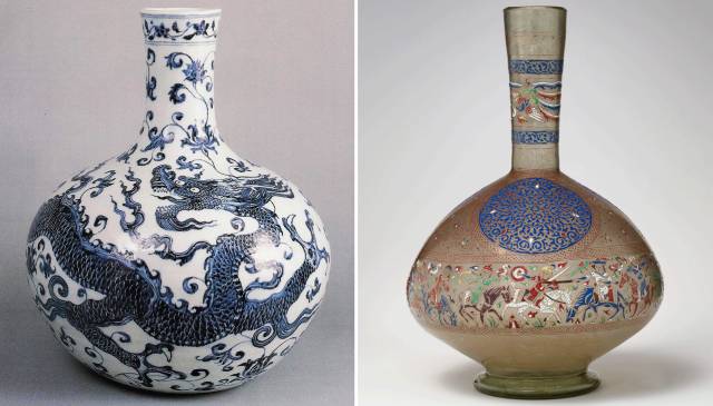 For example, the celestial sphere bottle (left), which has been popular since the Ming Dynasty (right), draws on the styling of a glass bottle made in Western Asia since the 8th century (right).